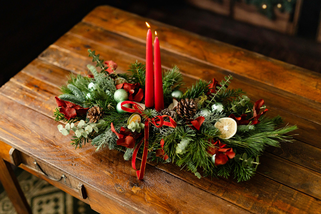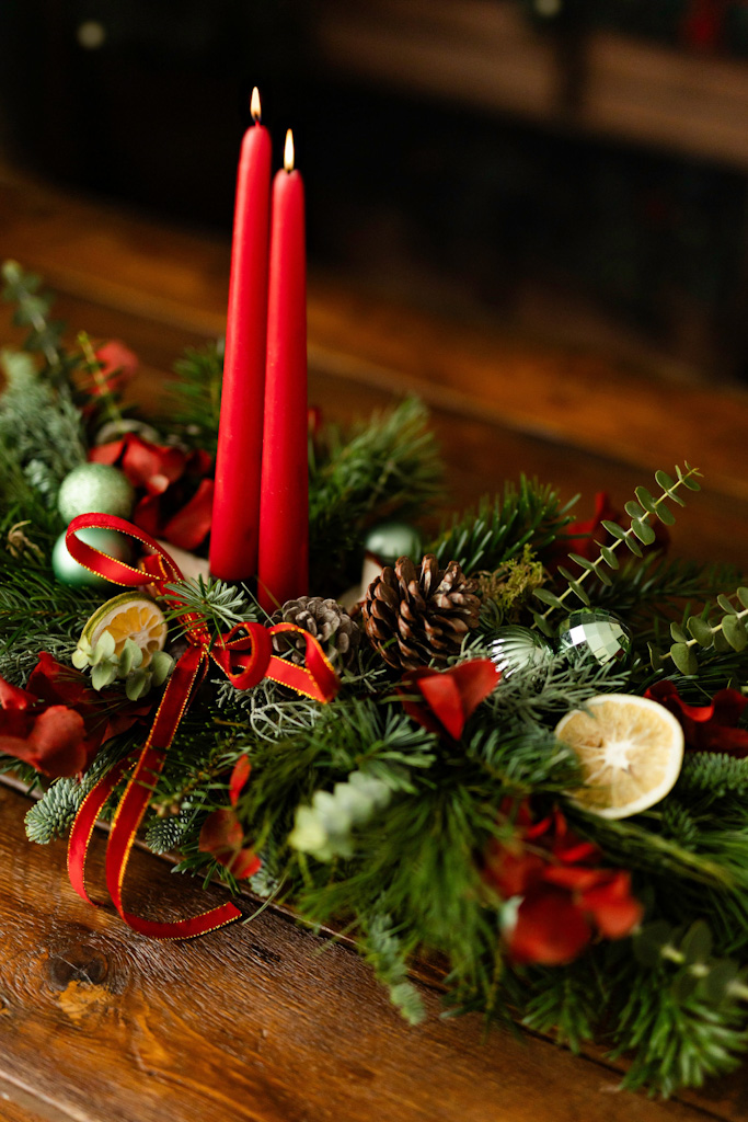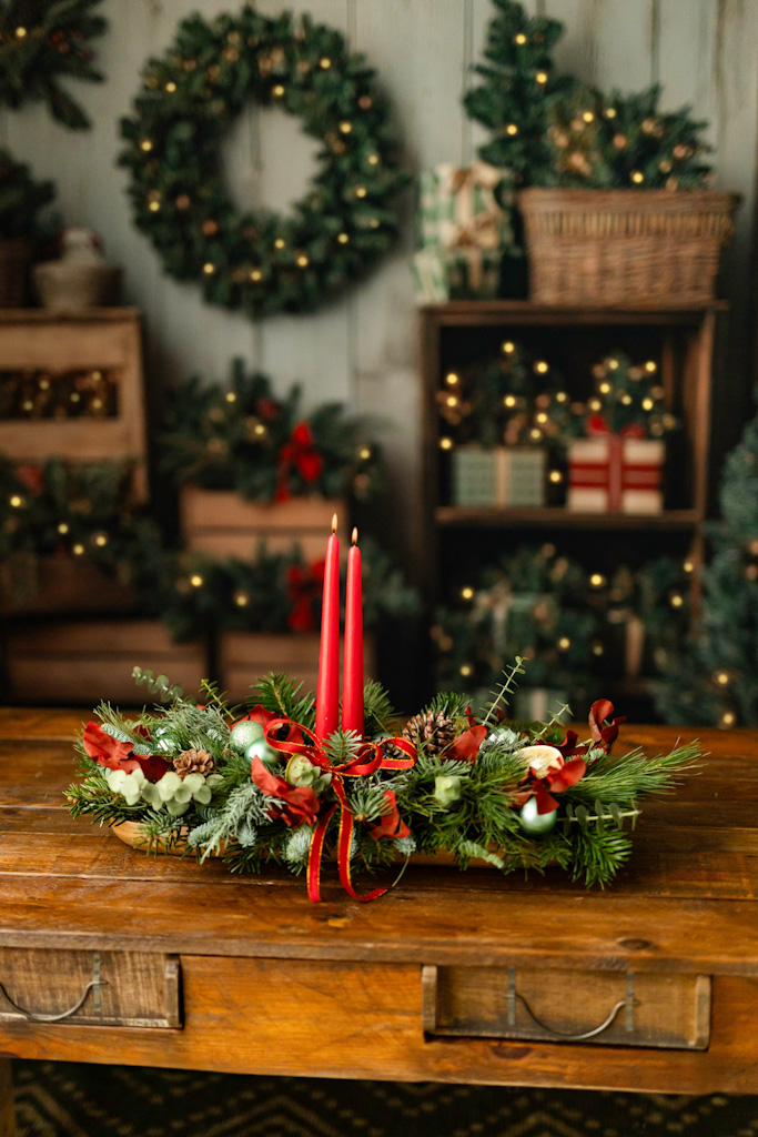 Verdes naturais frescos, materiais da natureza, berry’s e bola de natal. Este modelo pode ser personalizado nas seguintes cores: